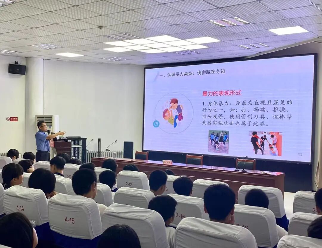课程围绕 "认识暴力类型、守护自我安全、养成良好习惯、共筑安全校园" 四大核心模块展开,既有案例警示也有实操教学。康同泽检察长通过剖析校园欺凌、家庭暴力、网络暴力等典型案例,警示同学们警惕暴力行为的危害;传授" 安全距离 ""智慧周旋"" 及时求助 "等实用自护技巧,强调生命安全优先原则;引用" 不以规矩,不成方圆 ",引导同学们从遵守校规、尊重他人权益做起,养成" 遇事找法、解决问题用法 "的法治思维;最后呼吁师生共同抵制不良行为,共建友善校园,并表示检察院将深化" 检校合作 ",与家庭、社会形成保护未成年人的强大合力。