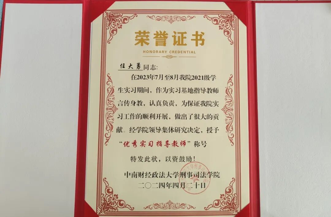 中南财经政法大学刑事司法学院授予干警任大勇“优秀实习导师”称号。